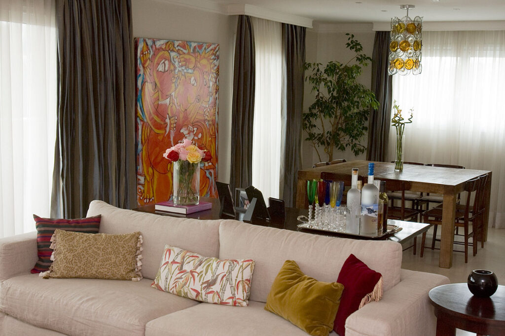 Apartamento para um homem separado com filhas. Como a arquitetura ja era bem monocromática , optamos por uma decoração moderna e colorida. O sofa Suite com linho cru e poltronas Isa da Dpot, mesa de centro da tora brasil, mesa lateral Carla vazada Micasa e tapete persa destonado da Botteh, ao fundo sofa Lovers com puff e luminária Double Shade Micasa, mesa de jantar acervo pessoal do cliente com cadeiras Soft Shell Micasa e aparador Mole da dpot, lustres Tom Dixon da Lumini.- Cliente